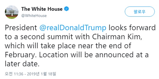 18일(이하 현지시간) 트럼프 대통령과 북한 김영철 노동당 부위원장 간 면담 직후, 미국 백악관은 트윗을 통해 “트럼프 대통령은 김 위원장과 2차 정상회담을 고대하고 있으며, (회담은) 2월말께 열릴 것”이라고 밝혔다. “장소는 나중에 발표될 것”이라고 덧붙였다.