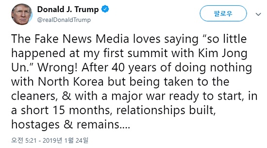 이날 트윗을 통해, 트럼프 대통령은 “가짜 뉴스 매체들은 김정은과 나의 첫 정상회담에서 아무 일도 없었다고 말하길 좋아한다. 틀렸다!”고 밝혔다.