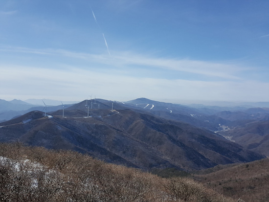 함백산 정상의 칼바람은 무서웠다. 바람 이놈이 나무에 가려 기세를 감추고 있다가 막힌 곳 없이 뻥 뚫린 정상에 도착하니 칼이 되어 달려든다. 정신이 얼얼할 정도로 불어댄다. 재빨리 무장을 하고 주위를 둘러본다. 나란히 줄서있는 풍력발전기, 태백선수촌, 하이원스키장, 전투기가 지나가고 남겨놓은 하늘의 흔적이 모여 함백산 정상의 경관을 완성했다. 속이 트이는 아름다운 경관이다. 기념촬영을 마치고 다음구간으로 전진한다.