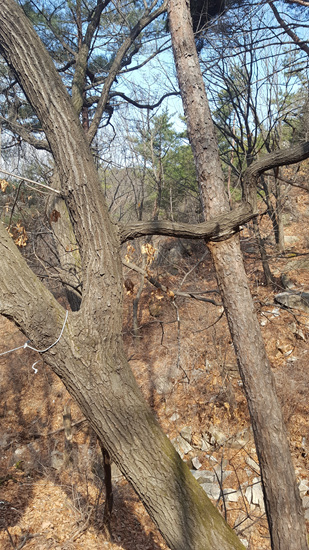 ▲ 참나무와 소나무가 붙어있는 희귀한 연리지. [사진제공-6.15산악회]