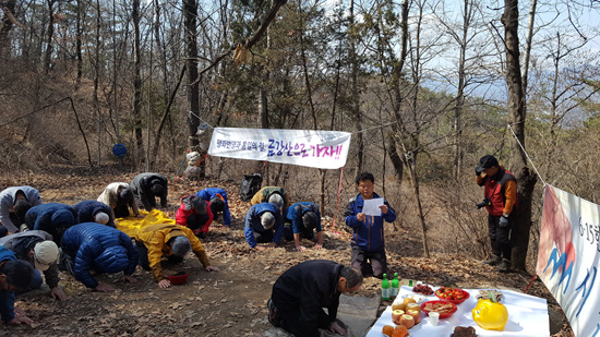 김래곤 총무가 정성 들여 마련해온 제물을 제사상에 진설하고 엄숙한 분위기 속에서 시산제가 시작되었다. 강신에 이어서 초헌관이신 회장님의 초헌과 함께 옆에서 이정태 축관이 공들여 지은 명문의 축문을 산신에게 축원하였고 제관들은 독축이 끝날 때까지 부복하며 경청하였다.