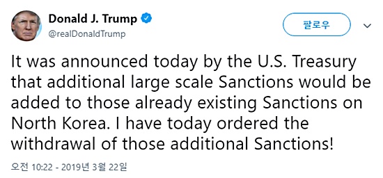 이날 트윗을 통해, 트럼프 대통령은 “오늘 재무부가 북한 관련해 이미 존재하는 제재에다 큰 규모의 제재를 추가한다고 발표했다”면서 “나는 오늘 이러한 추가 제재를 철회하라고 명령했다!”라고 밝혔다.