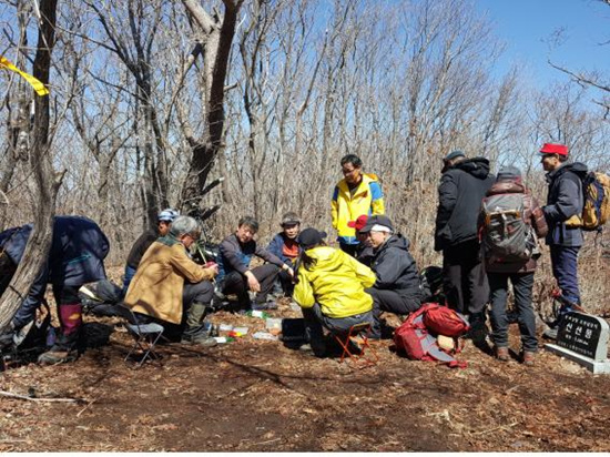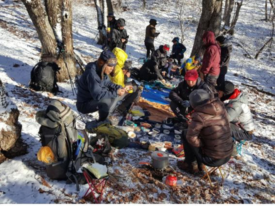 부쇠봉을 지나 깃대배기봉으로 가는 도중 양지바른 넓은 곳을 발견하여 아침식사를 하기로 하였다. 다들 준비한 밥과 도시락을 내놓고 맛있는 식사를 하며 반주 한 잔을 곁들인다. 전용정 대장은 맛있는 라면을 끓여 대원들을 대접한다.