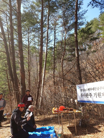 기원제는 김성국 대원의 사회로 이지련 단장의 인사말, 6.15산악회 김재선 총대장의 축문, 이계환 통일뉴스 대표의 절, 60대를 대표하여 김지영 원장의 인사말과 둘레길팀 등 각 그룹별 절이 이어졌다.