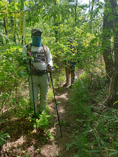 풀을 헤치고 산길로 뻗어 나온 나뭇가지를 피하며 산행을 한다.