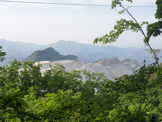 평탄한 숲길을 부지런히 걷다가 옆으로 석회석 채굴로 한참 깎여나간 자병산이 보인다.