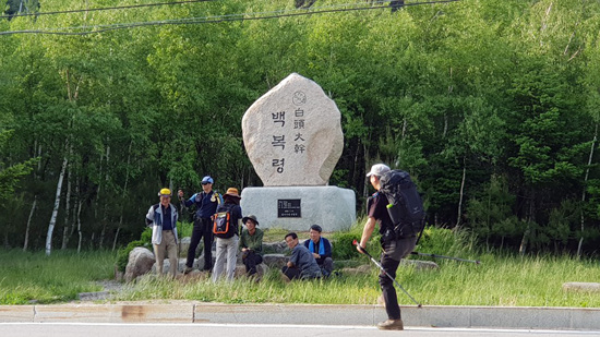 백봉령에 도착하니 일찍 헤어졌던 강남순, 김박 대원과 기사님, 먼저 도착한 대원들이 백봉령 표지판 아래에서 만나 즐겁게 회우하고 있다.