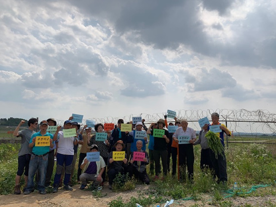 산행 일행들은 이어서 직접 비행기가 이착륙하는 활주로가 있는 공군기지 현장으로 이동하여 현장을 직접 탐방하면서 해설도 듣고 ‘미군은 이 땅을 떠나라’는 종이 피켓을 종이비행기로 만들어 기지 안으로 날리는 퍼포먼스도 진행하였다.