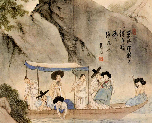 뱃놀이에 관한 대표적인 그림으로는 혜원 신윤복의 [주유청강]이 있다.