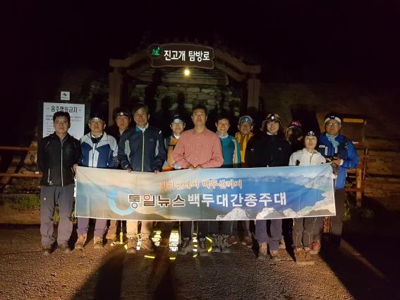 들머리에서 단체 사진을 찍고 3시 정각에 어둠속으로 첫발을 내디뎠다. 이번 산행은 능선에서 동해도 바라볼 수 있고 선자령의 광활한 초원지대도 볼 수 있다는 기대감으로 설레는 출발이다.