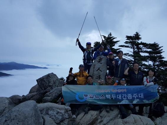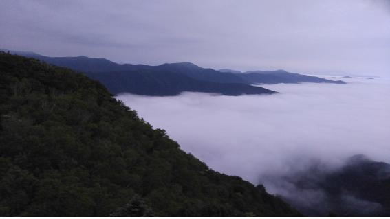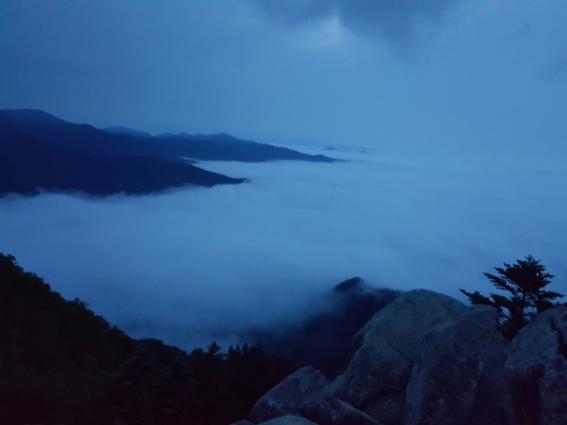 동해를 지배하고 있는 자욱한 운해. 그 아름다운 풍경에 넋을 놓았다. 동쪽은 운무에 가려져 있고 서쪽으로는 동트는 기운을 받은 황병산 정상이 모습을 드러내고 있는 것이다. 대원들은 이리저리 사진을 찍느라 분주하다. 놓치기 아까운 경치를 뒤로하고 노인봉 무인관리 휴게소에서 잠시 숨을 돌린 뒤 대간길로 가지 못하고 뒤돌아 가야 했다.