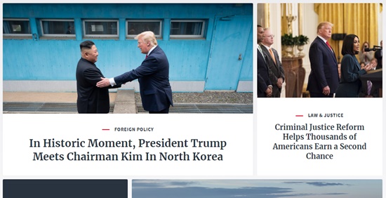 백악관은 홈페이지 메인 화면 2단에 지난달 30일 판문점 군사분계선(MDL)에서 트럼프 대통령이 김정은 북한 국무위원장과 만나 악수하는 사진을 올려 재선 출마를 선언한 트럼프 대통령의 외교 성과로 내세우고 있다.
