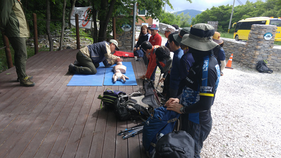 그리고 옆에서는 국립공원 직원들이 우리를 맞이해 주는데 그들은 등산객들에게 비상시 응급조치요령을 알려주기 위해 등산로 입구에 대기하는 사람들이다. 평소에 한번들어 보고 싶은 교육이었는데 마침 오늘처럼 여유가 있는 산행에 적당한 타이밍 이였다. 그들의 설명을 듣고 나서 산행을 시작하려니 어느새 10시가 조금 넘어가고 있었다.