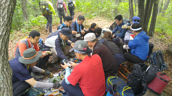 모두들 가져온 도시락을 펴는데 밴댕이회에 골뱅이 쌈채소 등 먹을 것이 풍성하다. 대원들끼리 반주도 한 잔씩 곁들이는데 현재 재활 중인 나로서는 그저 부러움으로 바라 볼 수밖에 없었다.