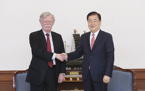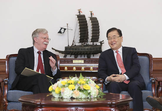 볼튼 보좌관은 이날 정의용 청와대 국가안보실장과 청와대에서 회담한 뒤 국방부청사에서 정경두 국방부장관과 면담하고 다시 청와대 안보실과 업무오찬을 가졌고, 이후 외교부청사를 찾아 강경화 외교부장관과 면담하는 등 숨가쁜 일정을 소화했다.