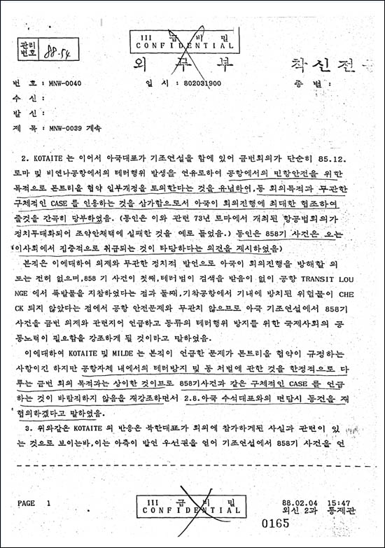 코타이트 의장은 이 자리에서 “회의목적과 무관한 구체적인 CASE[사례]를 인용하는 것을 삼가함으로서 아국이 회의진행에 최대한 협조하여 줄것을 간곡히 당부”했다(165쪽). 이에 한국측은 회의를 방해할 의도는 없으며, 이 사건이 회의 의제와도 관련이 있다고 말한다. 하지만 국제민간항공기구는 회의의 목적을 다시 설명하면서 KAL858기와 같은 구체적 사례를 언급하는 것은 “바람직하지 않음을 재강조”한다.
