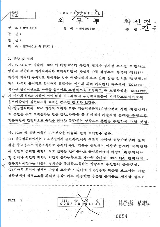 한편 정부는 1988년 3월에 열린 국제민간항공기구 이사회 회의에도 참관국으로 참석해 사건을 제기하려 했고, 이를 관철시킨다. 참고로 코타이트 의장은 “사건의 제기가 정치정[정치적] 요소를 포함하고 있다고 판단하고” 처음에는 이 계획에 부정적이었다(54쪽).