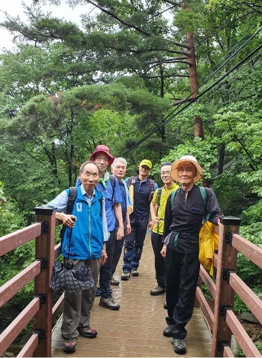이제 비는 그치고 햇살이 내리기 시작하면서 산행은 안정을 되찾았다. 사진도 찍고 산상강연도 했다. 강연은 먼저 권오헌 선생님이 ‘조미관계’, ‘남북관계’, ‘한일관계’에 관한 정세분석으로 시작했고 이어서 이종문 대원의 연대사업에 관한 소회를 말하는 것으로 마무리했다.