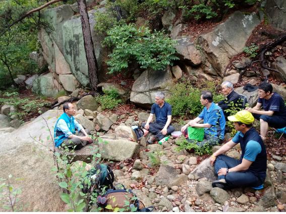 등산앱 등을 활용하면서 하산에 접어드는데 웬걸 길이 많이 험하다. 막힌 듯한 길을 이리 헤치고 저리 돌아 내려오기를 한참... 길이 좀 편해진다 싶더니 익숙한 곳이 나왔다. 오르던 길에 잠시 쉬었던 곳. 이젠 출발점으로 돌아가면 된다. 험로를 헤쳐 나오는 동안 김래곤, 이종문 그리고 신입 조장래 대원들이 앞장서서 어르신들을 챙겨드렸다.
