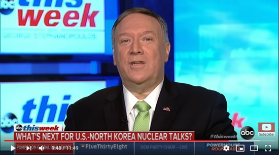 마이크 폼페이오 미국 국무장관이 8일(이하 현지시간) <ABC> ‘디스 위크’에 출연해 ‘김정은이 트럼프 대통령을 속이는 데 걱정되지 않느냐’는 질문을 받고 “우리는 김 위원장이 비핵화 약속을 계속해왔다는 걸 알고 있다. 몇일 또는 몇주 내에 그들과의 협상 테이블에 돌아가길 희망한다”면서 이같이 말했다.