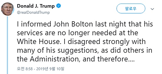 이날 트위터를 통해, 트럼프 대통령은 “나는 어제 밤 존 볼턴에게 백악관에서 그의 봉사는 더 이상 필요하지 않다고 통보했다”고 밝혔다.