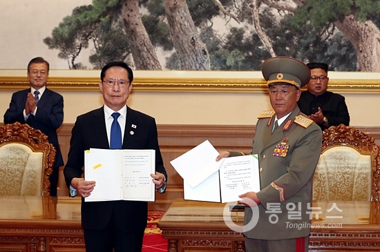 남북은 지난해 9월 평양정상회담을 계기로 군사분야 합의서에 서명하고 차근차근 이행했다. 지난해 11월 1일부터 지상.해상.공중을 비롯한 모든 공간에서 군사적 긴장과 충돌의 근원으로 되는 상대방에 대한 일체의 적대행위를 전면 중지했다.