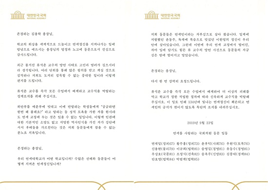 연세대 81학번인 송영길 더불어민주당 국회의원을 중심으로 한 연세대 출신 여야 국회의원들은 23일 김용학 연세대 총장에게 서한을 보내 류석춘 교수 파면을 요구했다.