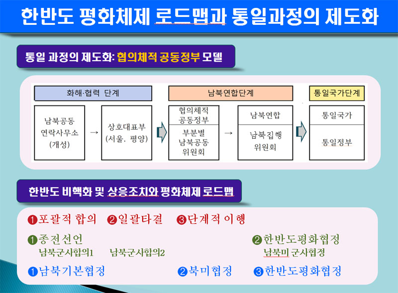 화해협력단계에서는 <개성 남북공동연락사무소 → 서울‧평양 상호대표부>로, 남북연합단계에서는 <부분별 남북공동위원회 → 남북집행위원회>로, 통일국가단계에서는 <통일정부>로 발전돼 나간다는 것이다.