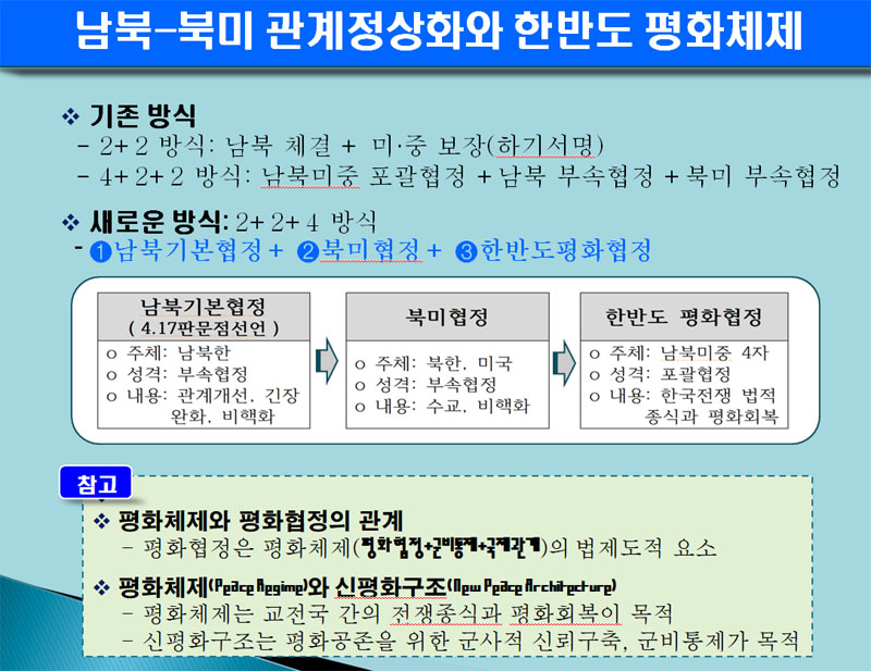 이어 “평화협정 체결은 2+2 방식이 기본내용이었다. 남북한이 합의하고 미국과 중국이 하기서명하는, 보증해주는 이런 형태로서의 평화협정이 필요하다는 게 지금까지 공개된 우리 정부의 공식 입장”이라고 설명했다.