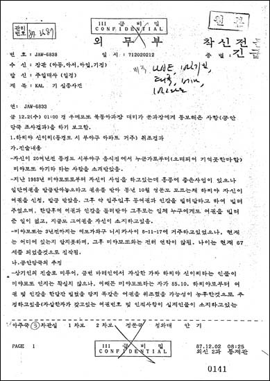 ‘문서상으로만 본다면’, 안기부가 이를 1987년 12월 2일 이전에 일본 당국으로부터 직접 전달받았거나, 12월 2일 외교부를 통해 전달받았을 가능성이 있다. 또한 일본 언론이 하치야 신이치를 인터뷰하기도 했는데 이 내용도 외교부 문서에 기록되어 있다(132-133쪽).