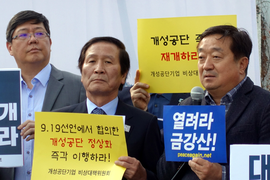 정기섭 개성공단기업협회 회장은 “과연 우리가 자주국가인가 주권이 있는 나라인가. 지금도 개성이 안 열리고 금강산관광 할 수 없는 것은 소위 워킹그룹이라는 이름하에 관료들의 고루한 생각으로 모든 것을 막는 그런 행태에서 비롯된다고 생각한다”며 “문재인 대통령이 용단을 내리셔야 한다. 우리가 자주국임을 나타낼 수 있는 그런 조치를 하루빨리 해주시길 간곡히 호소드린다”고 말했다.