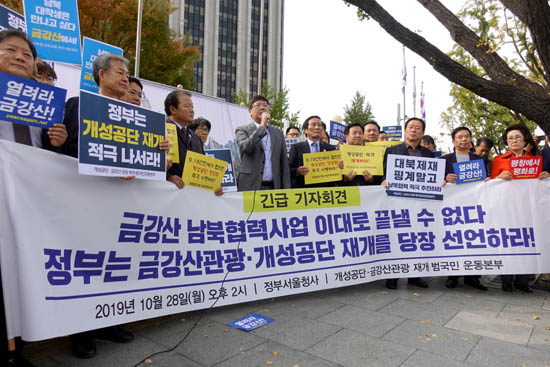 ‘개성공단 금강산관광 재개 범국민운동본부’는 28일 오후 2시 통일부가 있는 서울 광화문 정부서울청사 앞에서 기자회견을 갖고 “정부는 금강산관광 개성공단 재개를 당장 선언하라”고 촉구했다.
