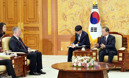 문재인 대통령이 16일 오전 청와대 본관에서 스티븐 비건 미국 국무부 대북정책 특별대표를 접견했다.