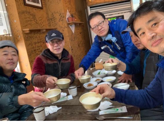 하산 후 이 지역을 잘 아는 박명한 대원의 추천으로 북한산성 맛집에서 새해 첫날의 감사한 떡국과 코다리찜과 재료를 아끼지 않은 부추전을 먹었다. 그리고 빠질 수 없는 막걸리 캬~. 하지만 나는 산행 후 어느 것과도 견줄 수 없는 막걸리의 환상적인 맛을 상상으로 대신했다. 새해의 다짐 실천!