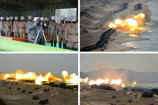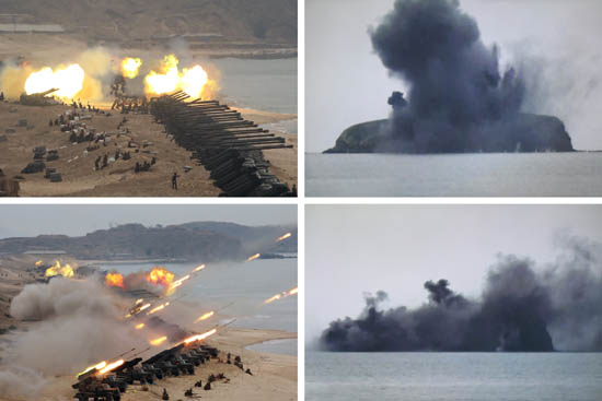 <조선중앙통신>과 <노동신문>은 이날 해안지역에서의 포들이 불을 뿜는 장면과 목표섬에서 검은 연기가 피어오르는 사진 등을 보도했다.