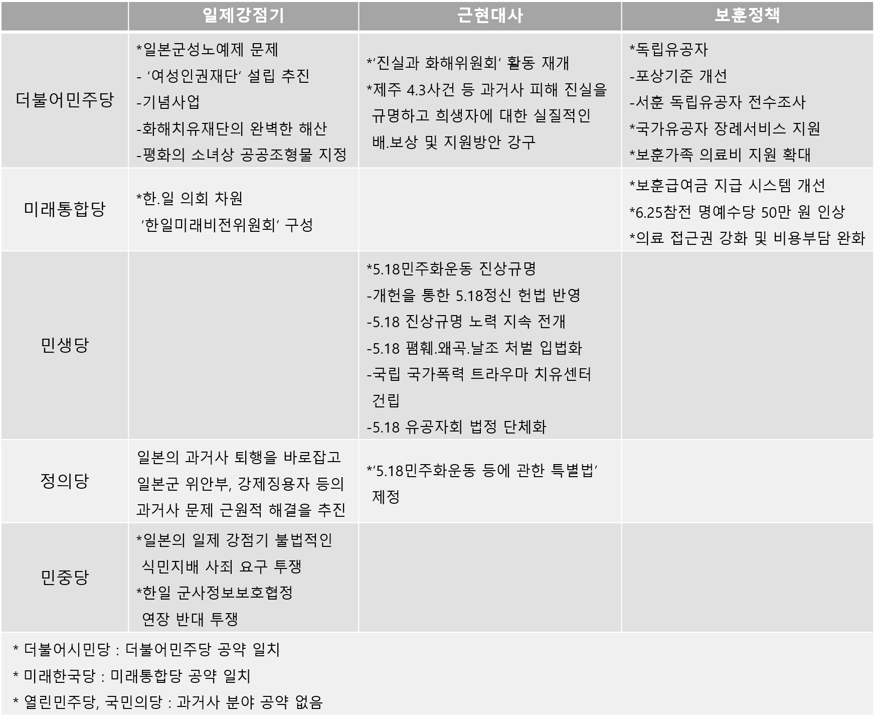 대다수의 정당이 일본군성노예제 문제 등 일제강점기 강제동원 문제 해법을 공약으로 제시했다.