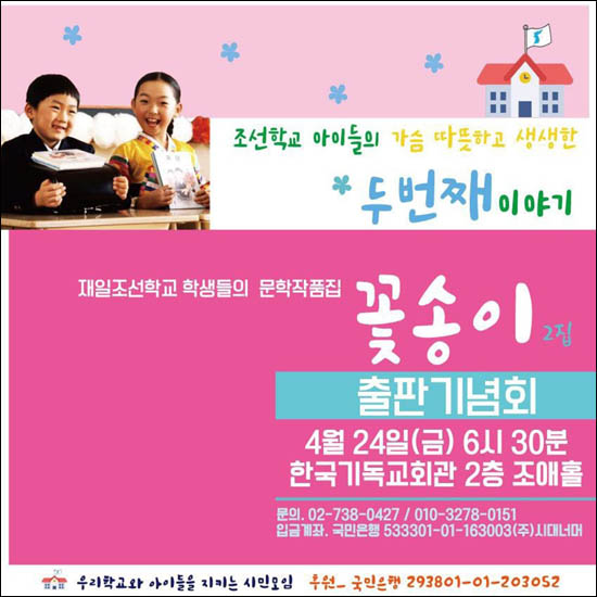 재일 조선학교 학생들의 문학작품집 『꽃송이』2집 ‘우리는 떳떳한 조선사람입니다’ 출판기념회가 24일 오후 6시 30분 서울 종로5가 한국기독교회관 2층 조애홀에서 열린다.