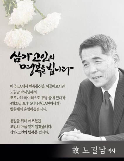 <민족통신>은 부고를 통해 “길남박사(민족통신대표)께서 지난 3월20일경 감기 몸살기운이있어 집에서 자가치료를 하다가 증상이 악화되어 그렌델지역 병원으로 옮겨 입원치료를 받던중 4월25일 오후 5시 41분에 향년 76세로 운명했다”며 “장례식은 따로하지 않고 추모모임만 가족위주로 갖기로 했다”고 알렸다.