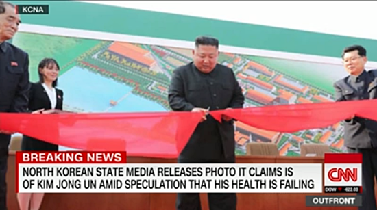 지난달 21일 ‘김정은 중태설’로 전 세계를 놀라게 했던 미국 <CNN>도 이날 <조선중앙통신>을 인용해 김정은 위원장의 공개활동 재개를 신속 보도했다. 김 위원장이 준공식 테이프를 끊는 사진도 내보냈다.