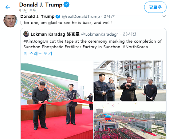 그는 “나로서는 그(김정은)가 돌아오고 건강한 것을 보게 되어 기쁘다”는 트윗을 올렸다. 지난 1일 평남 순천인비료공장 준공식에서 준공 테이프를 끊는 김정은 위원장의 사진 등을 담은 트윗에 답변하는 방식을 취했다.