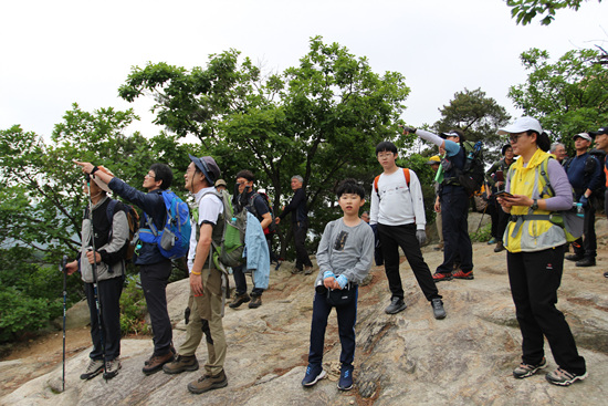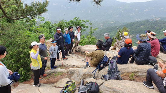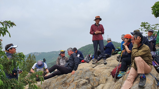 이렇게 점심을 마치고 국기봉을 향해 가는 줄 알았는데 바로 옆에 있는 큰 너럭바위에 앉으라고 한다. 올라오는 도중 중간중간 쉬면서 산상강연을 이 분 저 분에게 요청했는데 하겠다고 나서는 사람이 없었다. 권오헌 회장님이 산행에 동행을 하실 경우에는 으레 산상강연을 해주셨는데 이번 산행에는 안 오셨다. 산상강연이 없는데 앉으라고 한 뜻은, 일단 단체사진을 찍은 뒤 자기소개를 하는 시간을 갖겠다고 하는 것이었다. 그런데 사회를 맡은 이종문 회원이 나를 처음으로 지목한다. 산행기를 써야 하는 사람이 제일 먼저 소개를 하는 것이 관행이란다.