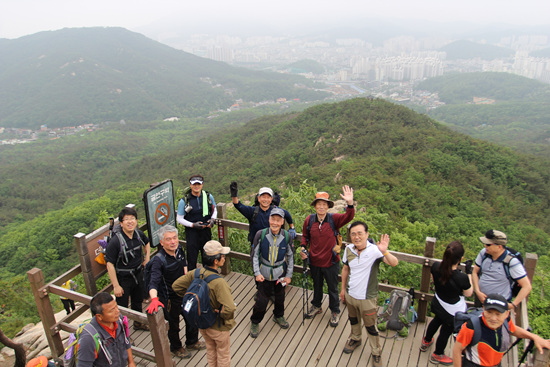 얼마를 오르니 널찍한 바위가 나온다. 경사가 가파른 만큼 쉼터를 기대했던 건 나만은 아니었다 싶다. 모두 기다렸다는 듯 삼삼오오 모여앉아 이런저런 얘기를 하며 거친 호흡을 고르며 아래쪽으로 내려다보이는 전망을 즐긴다. 가파른 경사를 올라와서인지 안양과 군포, 의왕시 일대가 훤히 내려다 보였다.