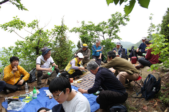 국기봉을 향해 가는데 허기를 느꼈는지 김재선 대장이 식사를 하고 올라가잔다. 20여명이 함께 앉아야 하니 자리를 여기저기 둘러본다. 마땅한 곳을 골라 점심먹기 편하게 앉는다. 산행 중에 먹는 점심처럼 맛있는 식사는 많지 않을 것이다. 준비한 도시락을 꺼내 하나 집어 먹는데 맞은편에 앉은 박영태 회원이 집에서 어머님이 직접 빚은 것이라면서 흰 팥고물에 쌓인 쑥떡을 건넨다.