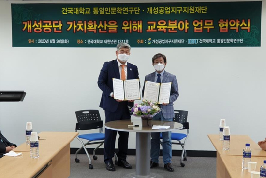 개성공업지구지원재단(이사장 김진향, 재단)과 건국대학교 통일인문학연구단(단장 김성민)은 30일 개성공단 가치확산을 위한 교육분야 업무협약을 체결했다.