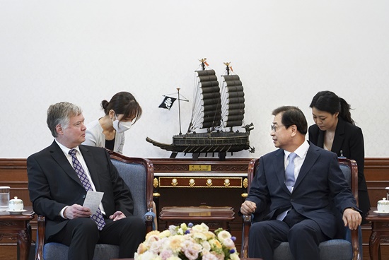 서훈 국가안보실장이 9일 오전 10시부터 70분 간 청와대에서 스티븐 비건 미국 국무부 부장관 겸 대북특별대표를 면담했다.