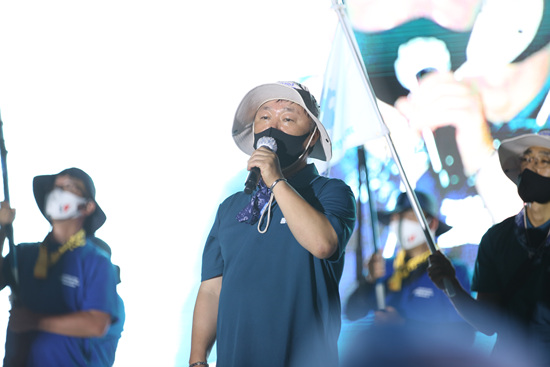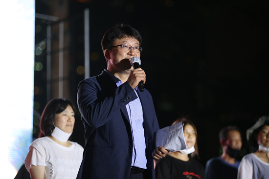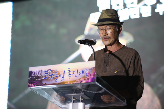 ▲ 사회를 맡은 원진욱 범민련 남측본부 사무처장은 “코로나 재확산과 장마와 폭우 등 여러 가지 악조건에도 불구하고 대회를 성사하겠다는 실천의지와 기층의 힘으로 대회를 성사하였다.”고 선포하고 “전국에서 달려온 동지들을 열렬히 환영한다”고 말했다. [사진제공-조국통일촉진대회준비위원회]