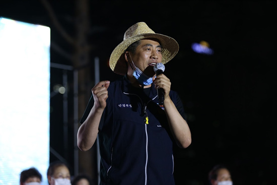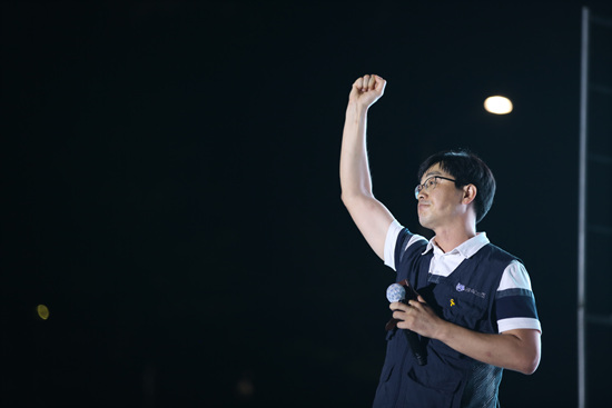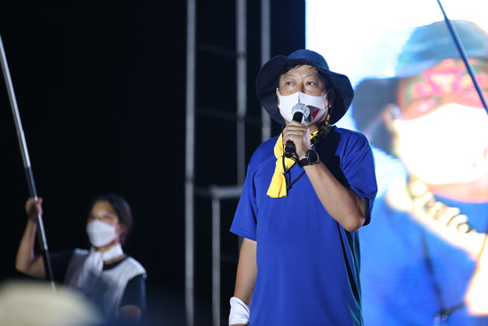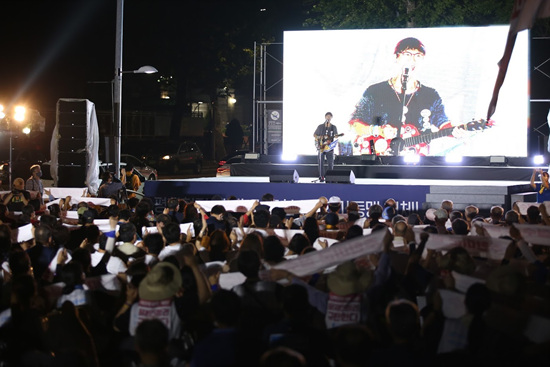 ▲ 박준 민중가수. ‘힘들지요’, ‘질긴 놈이 승리한다’ 2곡을 참가자들과 함께 부르면서 서로서로를 응원하고 단결투쟁으로 반드시 승리하자고 다짐했다. [사진제공-조국통일촉진대회준비위원회]