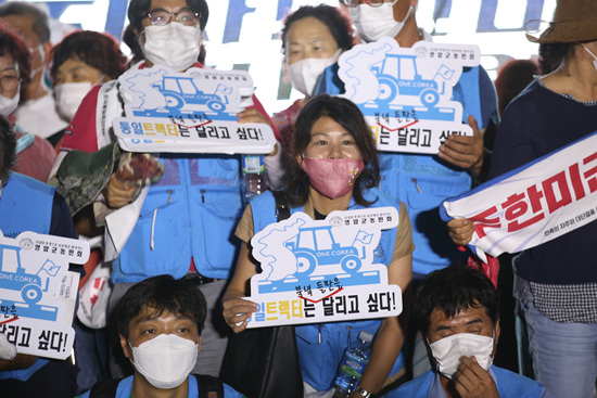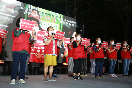 ▲ 민주연합노조 톨게이트지부 조합원들. “비정규직철폐연대가” 노래에 맞쳐 힘찬 율동으로 1부 순서를 시작했다. 민주연합노조 톨게이트지부 도명화 지부장과 조합원들은 “동지들의 연대와 응원으로 직접고용 투쟁은 이겼지만 다시 원직복직을 위한 힘든 투쟁을 하고 있다”고 전하고 “반드시 2차 투쟁도 이기는 노동자가 되겠다”고 다짐했다. [사진제공-조국통일촉진대회준비위원회]
