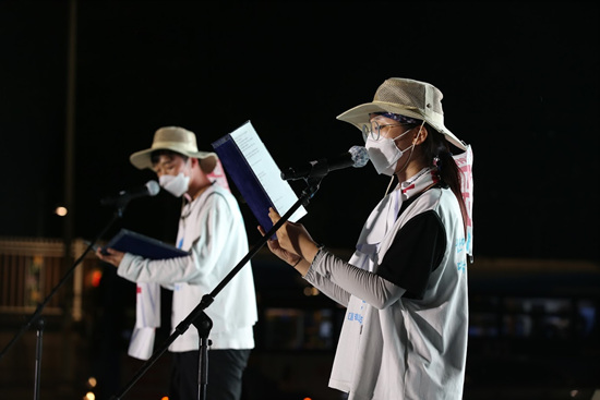 ▲ 결의문 낭독을 하고 있는 민대협 통일선봉대 청년학생들. 참가자들은 결의문을 통해 “자주와 애국을 위해 반미투쟁을 상설화하고, <우리민족끼리> 고난도 기쁨도 단합도 투쟁도 함께 해나갈 것”을 결의했다. [사진제공-조국통일촉진대회준비위원회]