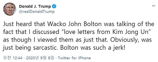 이날 트윗을 통해 트럼프 대통령은 “또라이 존 볼턴이 내가 “김정은에게서 온 러브레터”라고 말했을 때 내가 정말 러브레터라 봤던 것처럼 얘기했다고 방금 들었다”면서 “분명히, 비아냥에 불과했다. 볼턴은 정말 머저리였다!”고 비난했다.
